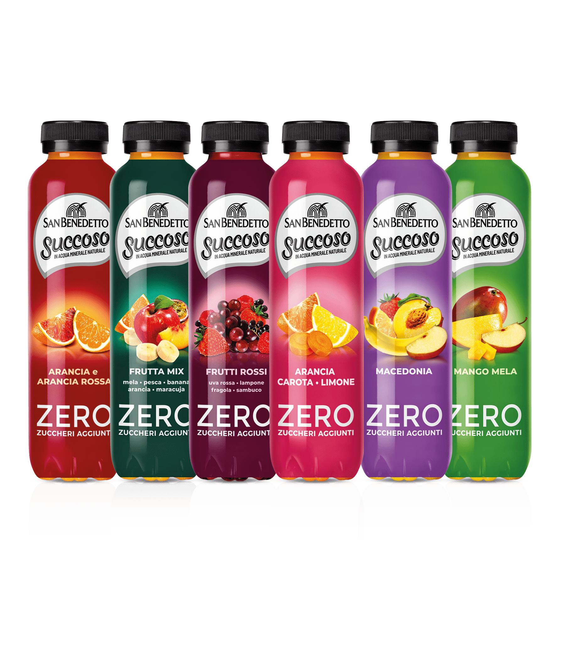 Succoso Zero 0,40L, zero zuccheri aggiunti, è disponibile in 6 varianti di gusto, in grado di soddisfare le preferenze di tutta la famiglia: Frutti Rossi per una pausa dolce e dissetante, Arancia Carota Limone una spremuta di energia, Arancia e Arancia Rossa per iniziare la giornata con la giusta carica, Frutta Mix, per una pausa di naturale dolcezza, Macedonia, per chi ama i frutti più delicati, Mango Mela, dolce e dissetante.